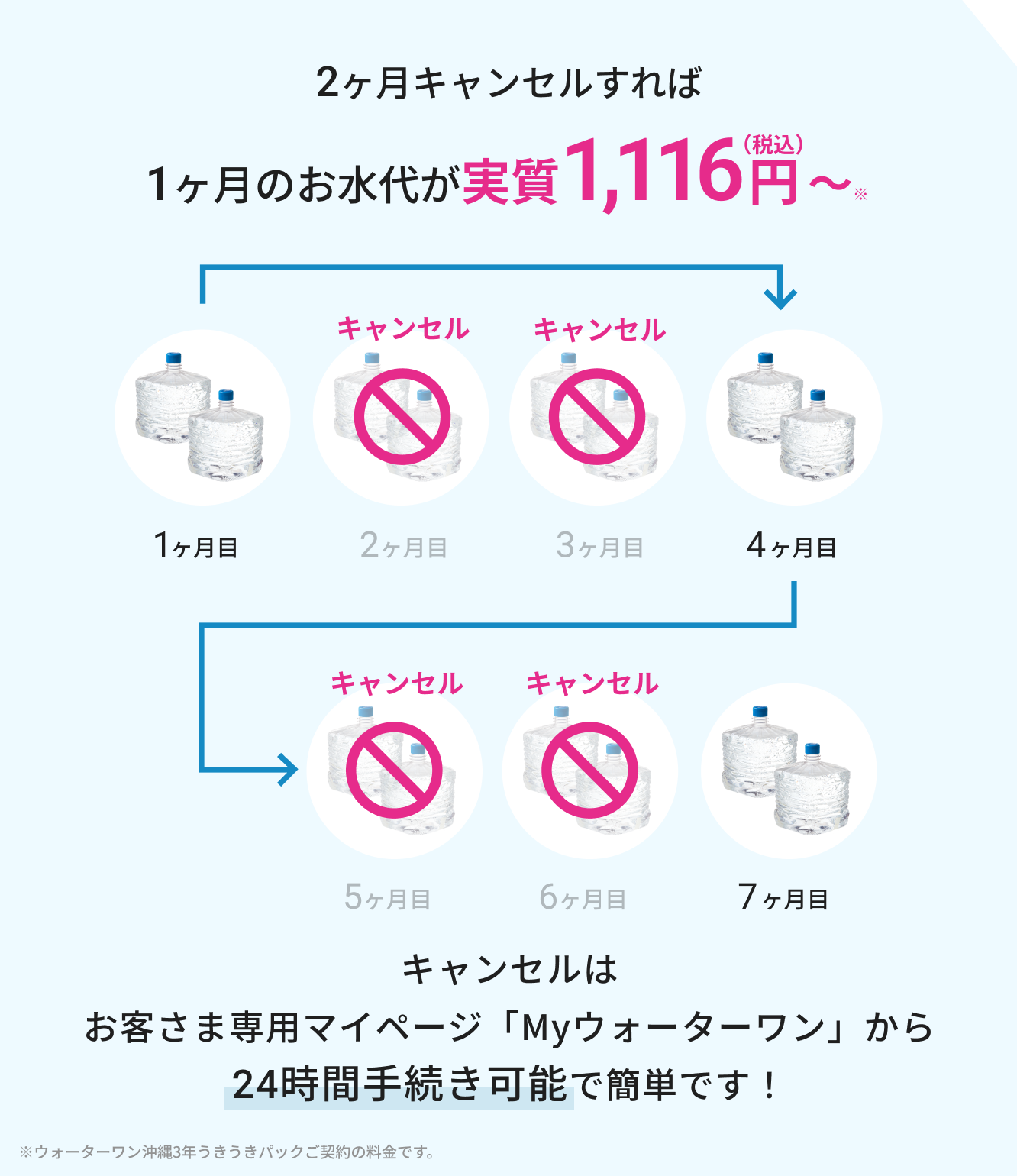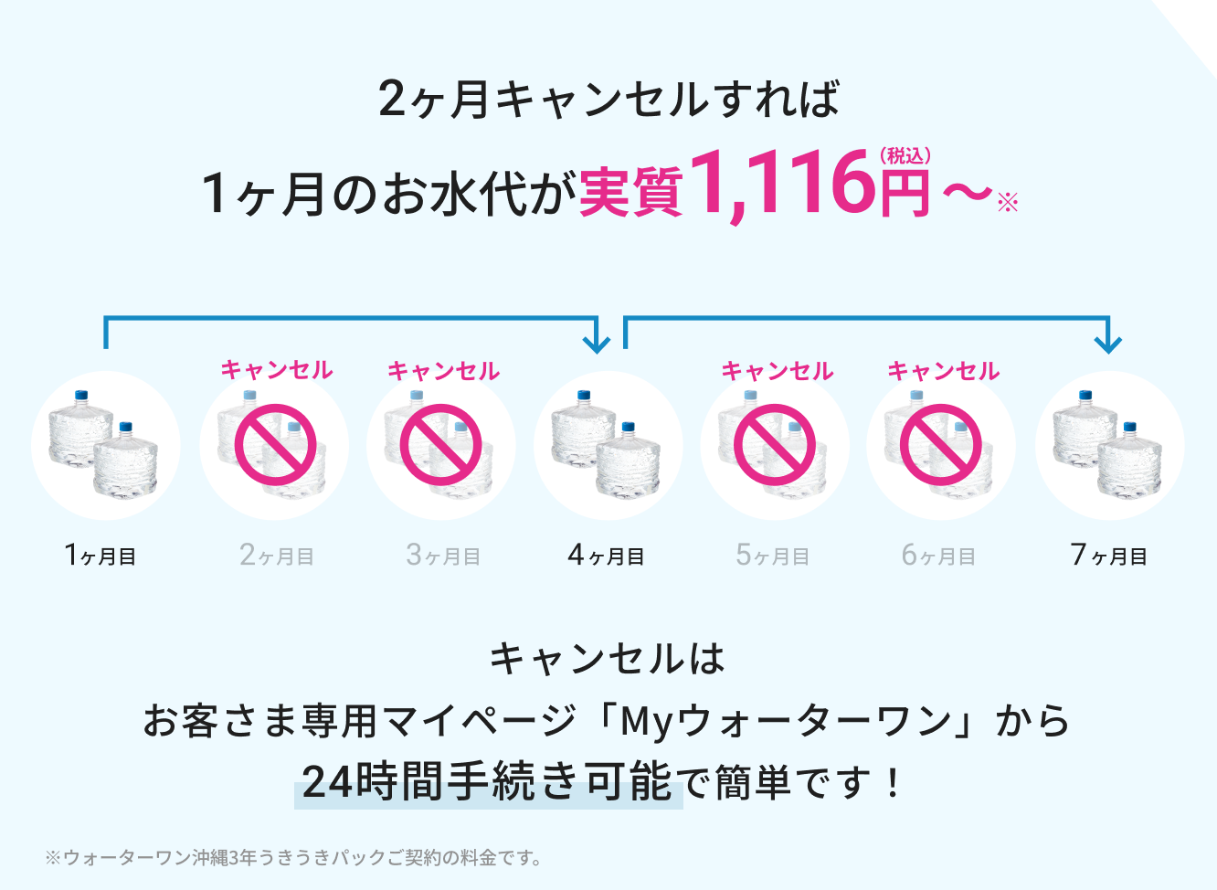 キャンセルは、お届け日の8日前までにお願いいたします。お手続きは、お客さま専用マイページ「Myウォーターワン(マイウォーターワン)」にてお受けします。